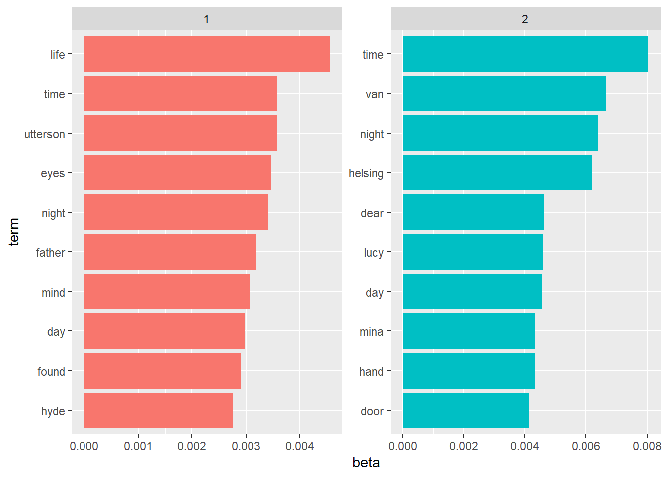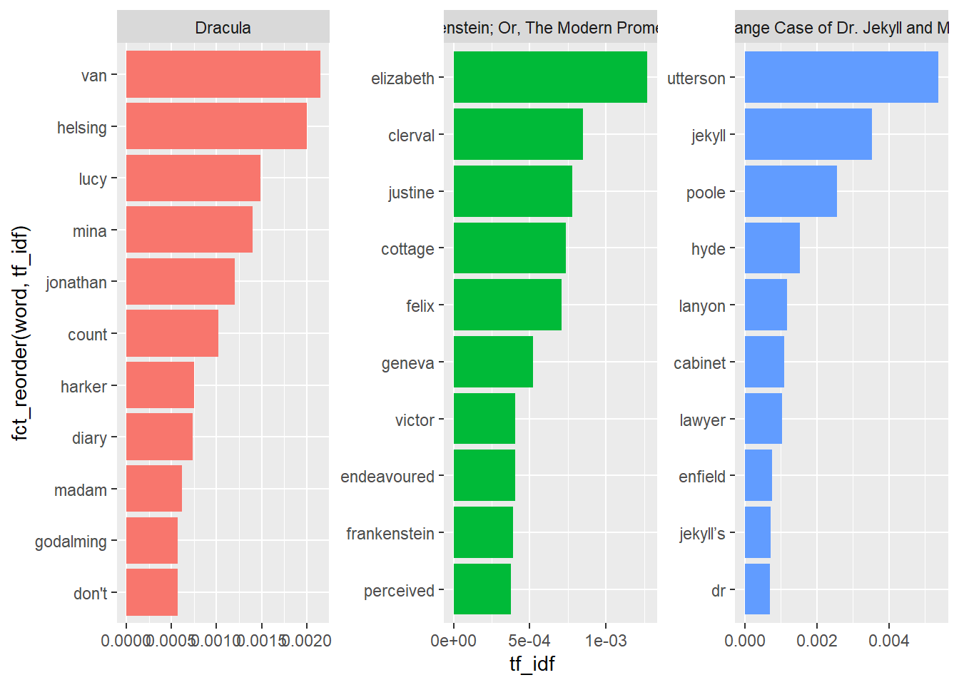 mutate(chapter_factor = factor(chapter))to treat chapter as a factor variable.)Make a faceted bar plot showing the top 10 words that distinguish each book according to the tf-idf statistic.