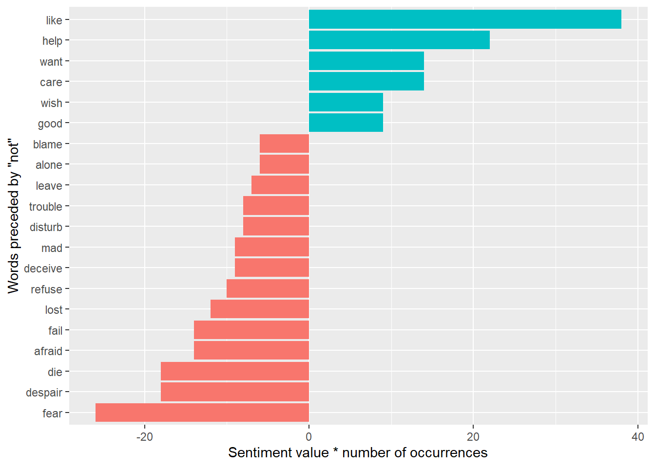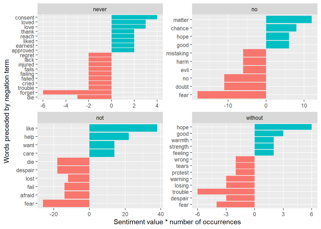 Find which words contributed most in the “wrong” direction using the afinn sentiment combined with how often a word appears among all 7 books. Come up with a list of 4 negation words, and for each negation word, illustrate the words associated with the largest “wrong” contributions in a faceted bar plot.
