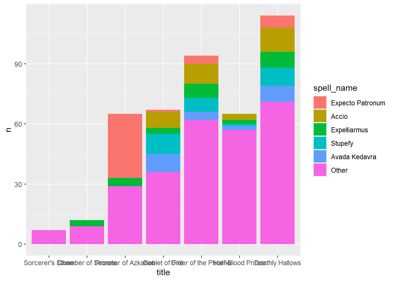 geom_col(aes(x = title, y = n, fill = spell_name), position = "stack")