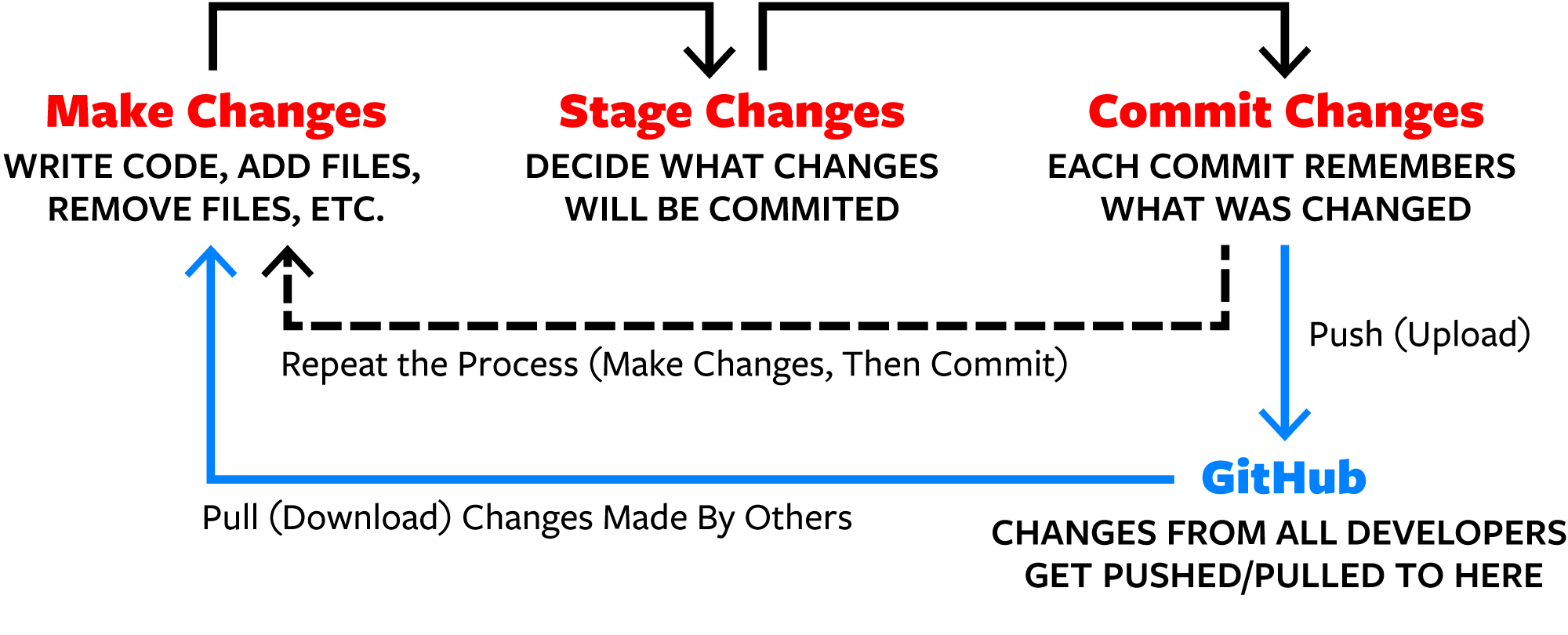 Here is an illustration (source) of the process of using GitHub to manage version control and collaboration, followed by greater detail about each step: